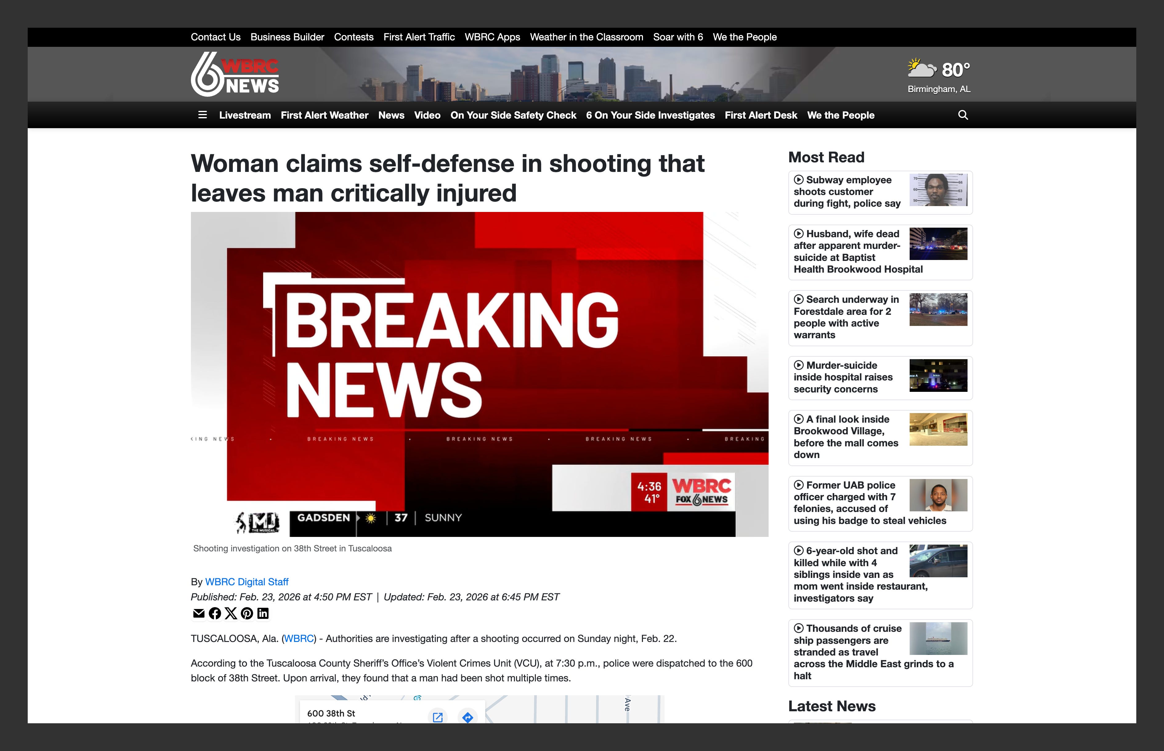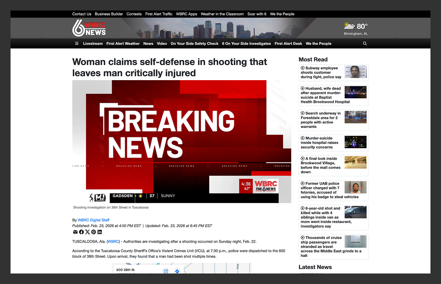 Tuscaloosa: A woman called 911 to tell them she had run away and locked herself in a nearby car to get away from an ex with a history of domestic violence with her, and reported that he was pounding on the car and trying to break windows to get to her. When police arrived, they found that she had shot him in what she claimed was self-defense. Police say the investigation is ongoing and that “no arrests have been made since issues of self-defense are present.”