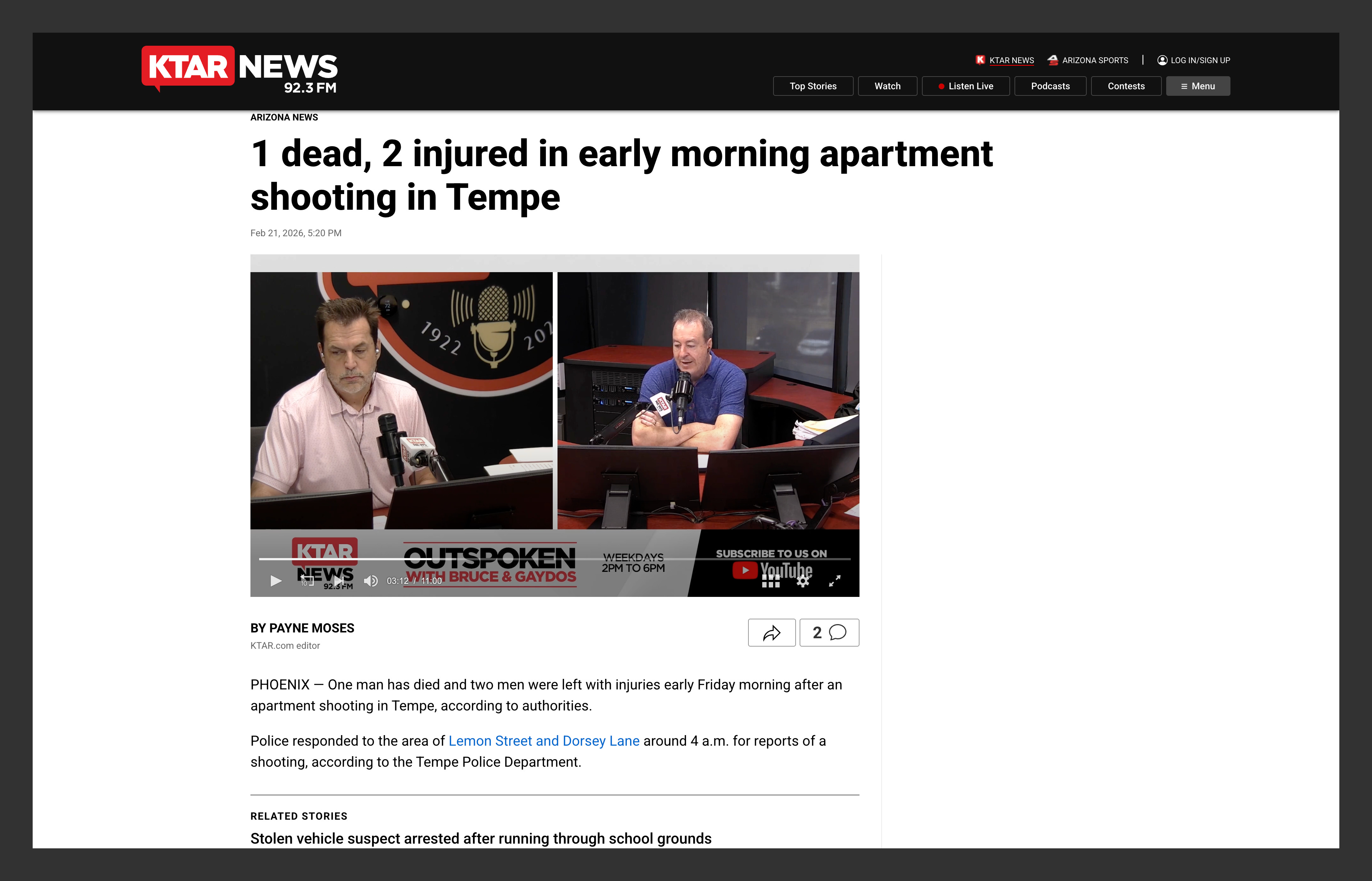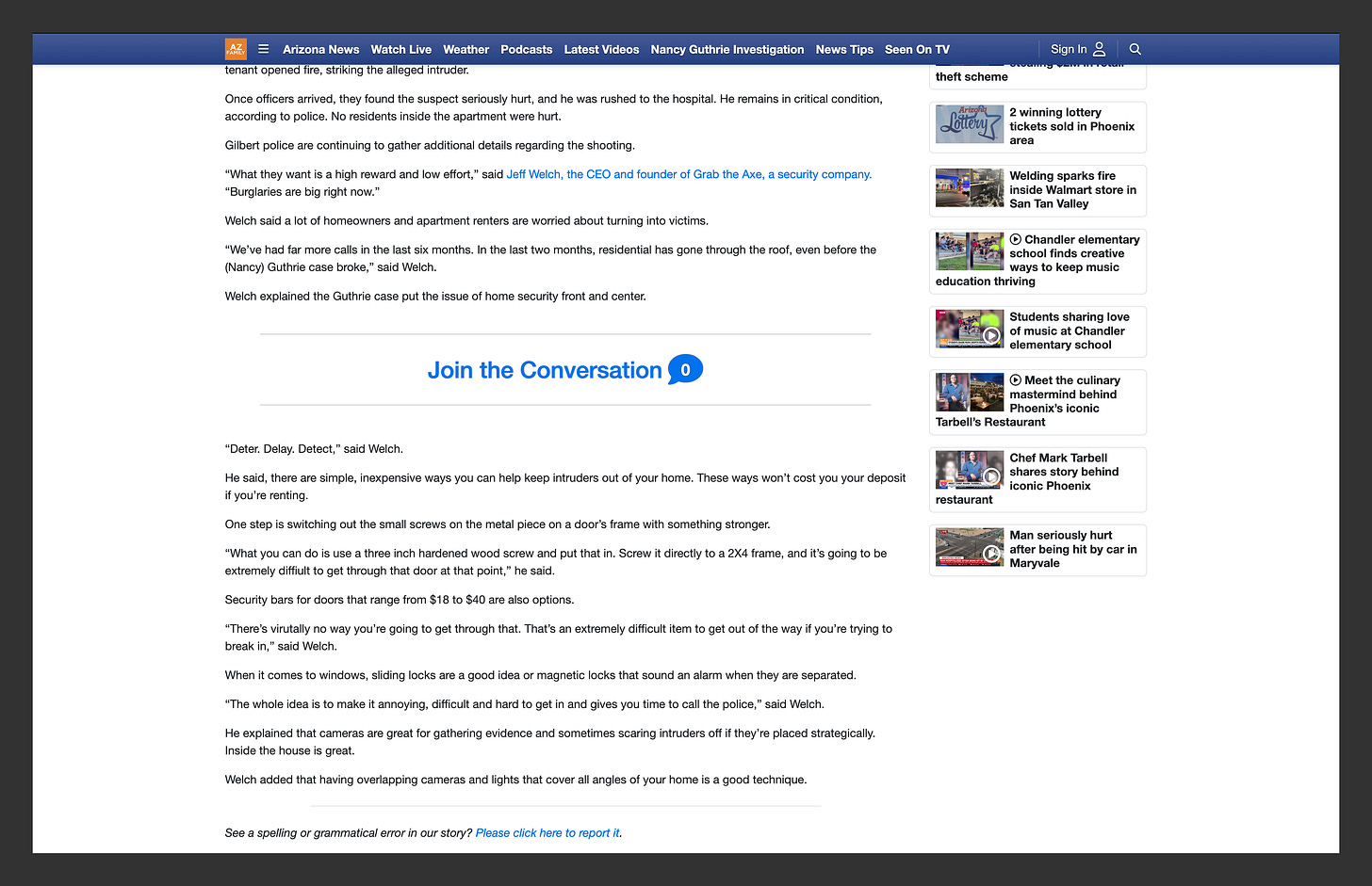 Gilbert: Police responded to a 911 call about a man breaking into the caller’s apartment, with the caller reporting that the invader assaulted someone in the home. The tenant opened fire, crucially wounding the invader, who was rushed to the hospital when police arrived. After describing the shooting in three short paragraphs, one of the articles then goes on for another 14 paragraphs with tips from the CEO of a security company called “Grab the Axe” on inexpensive modifications that renters can make to their apartments to try and protect themselves from home invaders without losing their security deposit—but in all those paragraphs, never once did Grab the Axe mention grabbing a gun for self-defense, even though that’s exactly how the tenant victim that was the original subject of the article protected himself.
