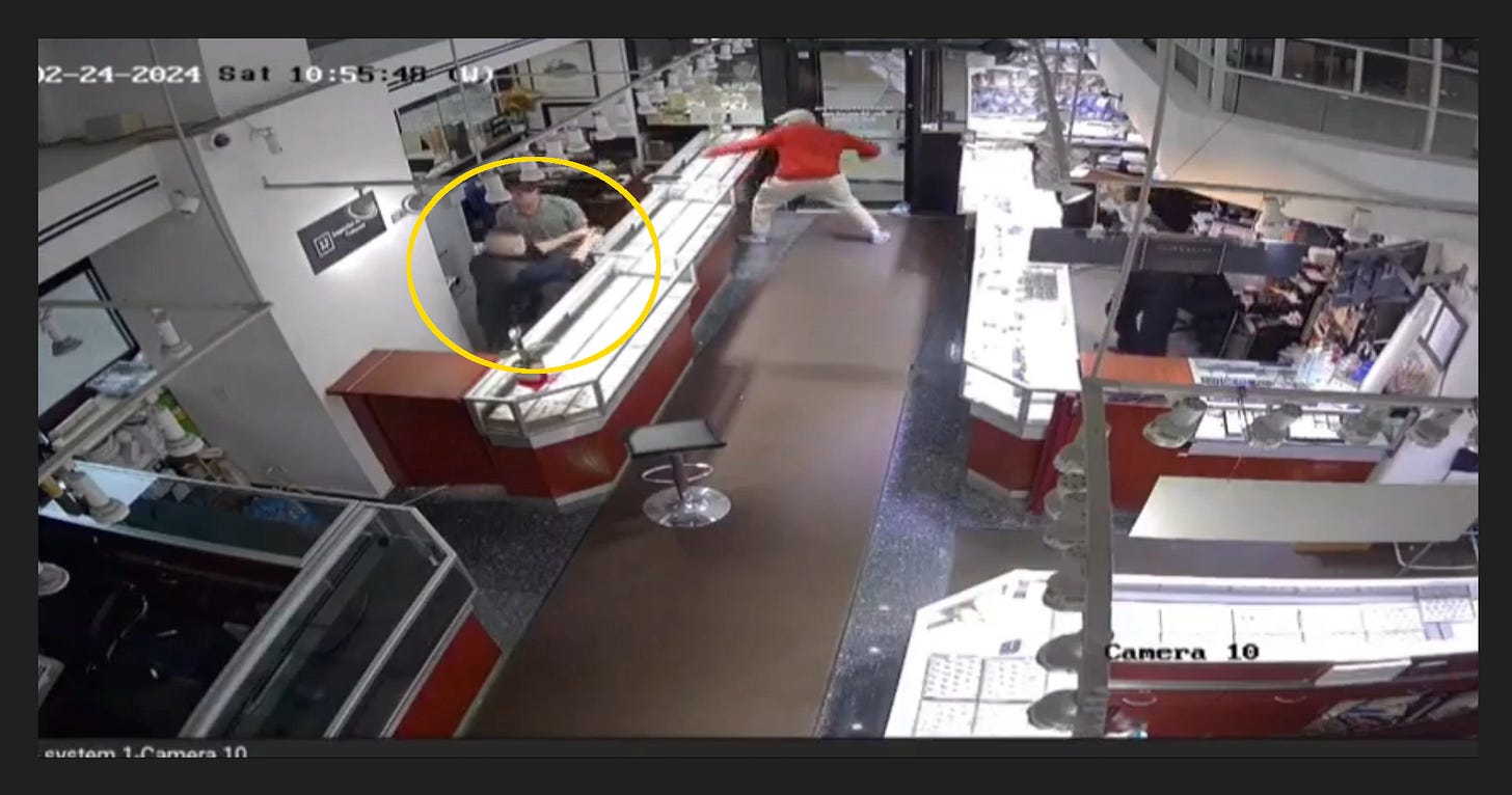 Around 11 AM on a Saturday morning, a 27-year-old man in a red sweatshirt was walking around in the Landmark Diamond Center jewelry store in Chicago.