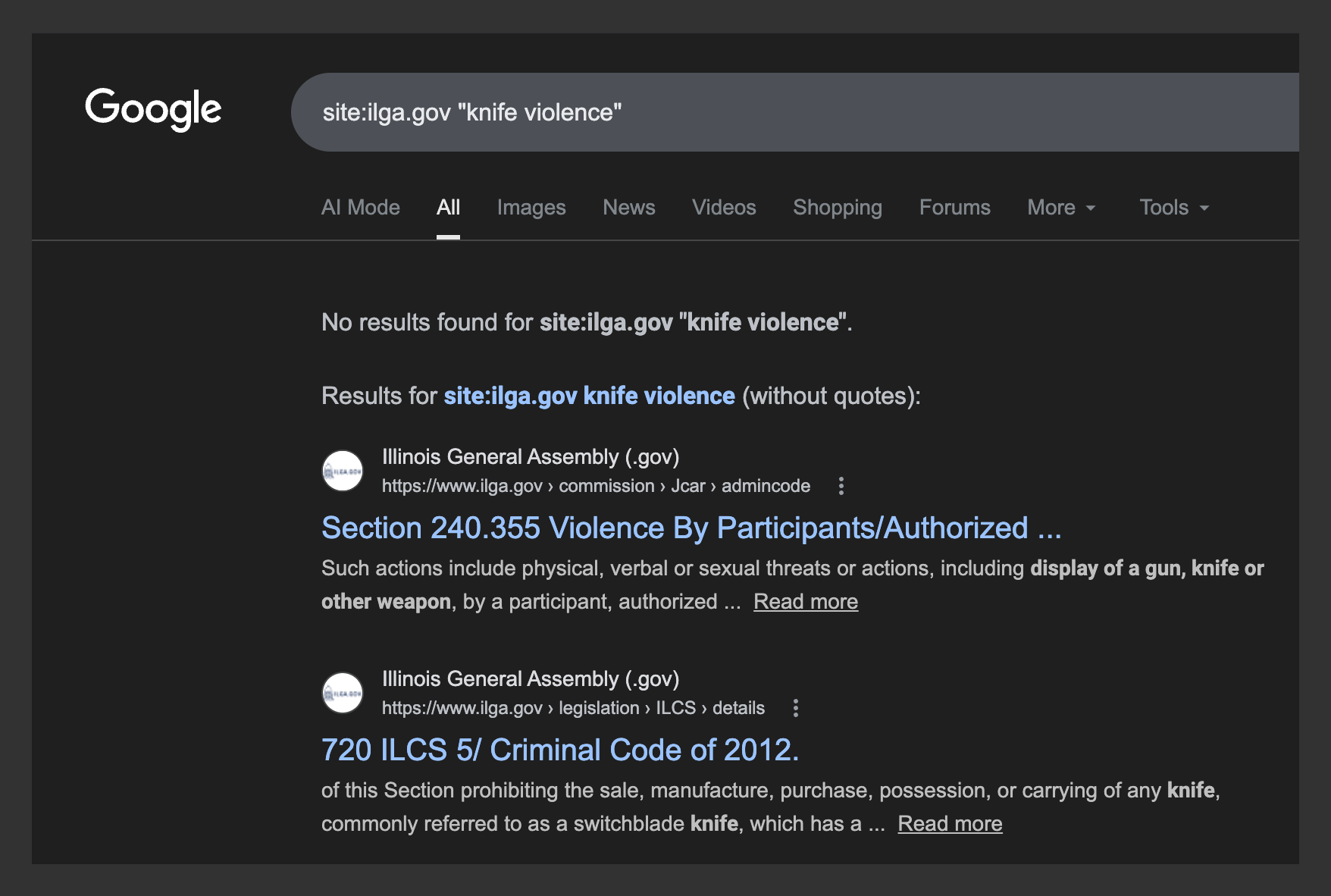Yeah, “gun violence.” There’s not one mention of “knife violence” on the Illinois legislature’s website, though.