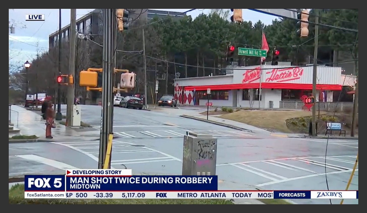 Howell Mill Road in West Midtown Atlanta is the kind of street you know if you know Atlanta — a popular place with restaurants like Hattie B’s and Snooze. At just before 4 AM on a Sunday, the restaurants are dark and the parking lot is quiet.