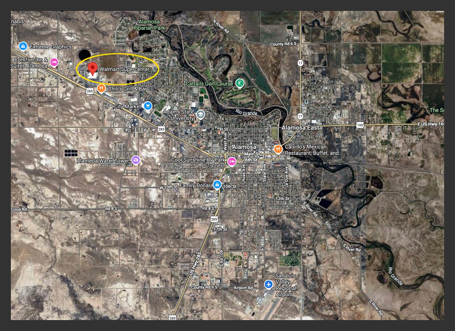 Alamosa, Colorado is a town of just under 10,000 permanent residents that sits on the Rio Grande. The total number of people residing there is seasonal, fluctuating with tourist season and the schedule of Adams State University. It’s big enough to have a Walmart, but small enough that it has only one zip code.