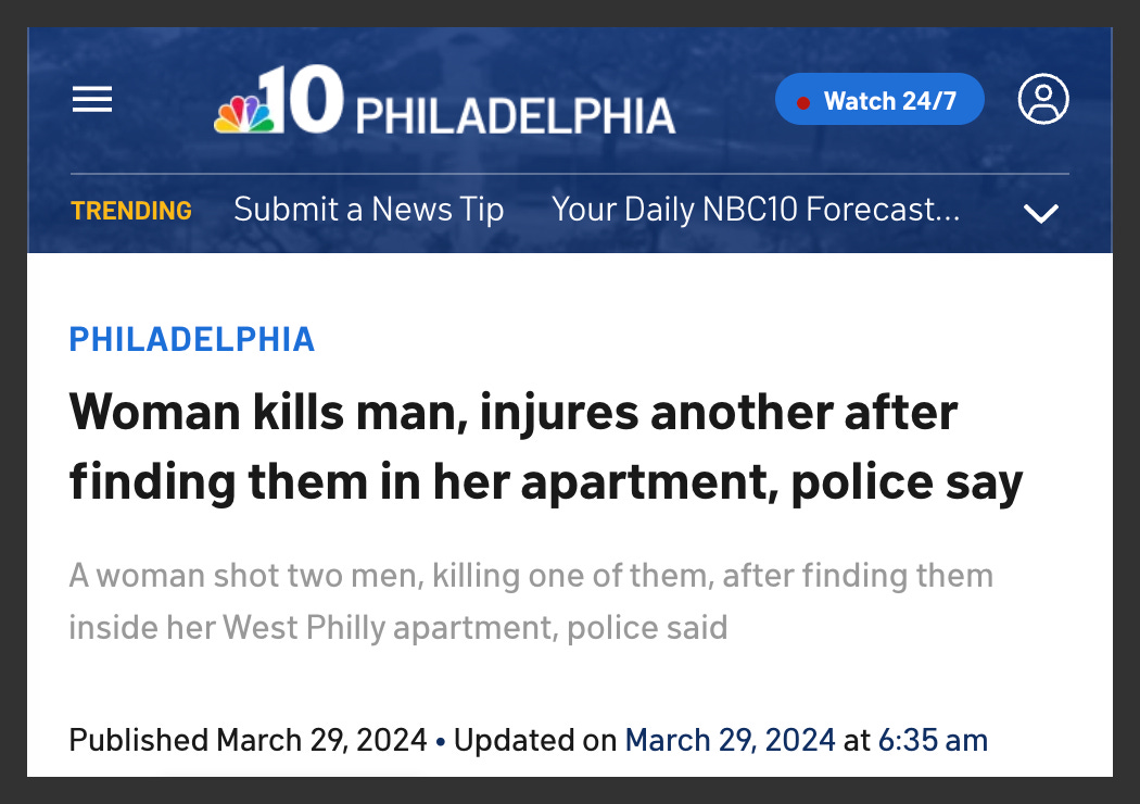 One woman who's competent with her firearm. Two men in her apartment, disguised as police officers. One dead, one wounded. Neither was her. | Original incident: March 29, 2024