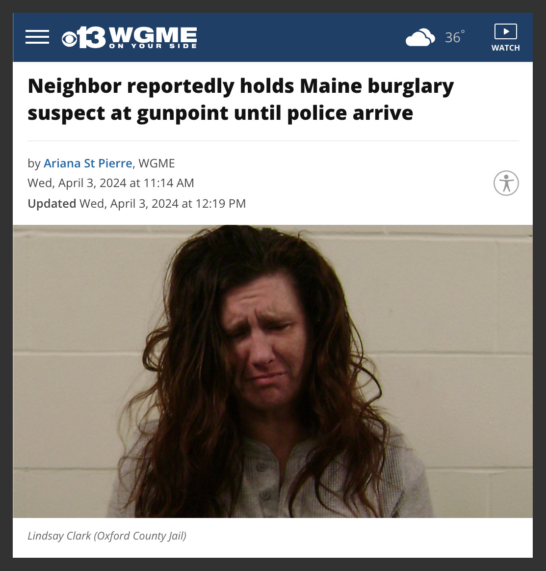 In this case, it happened in Norway, Maine, where a woman was prevented from breaking into a home and was held for police with nary a shot fired.