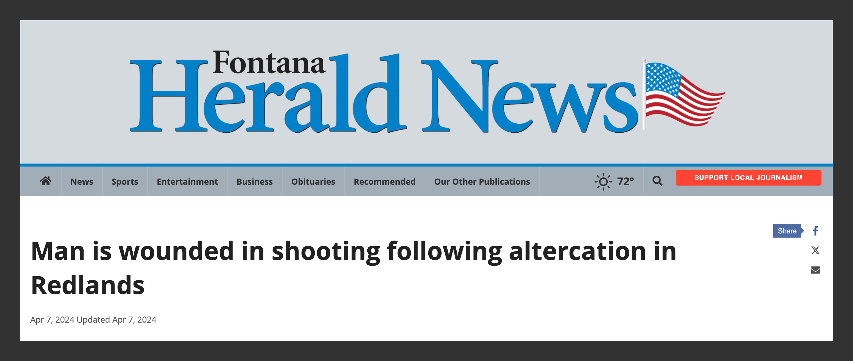 According to witnesses and investigation, the victim confronted the suspect on Park Avenue south of Redlands Boulevard and a physical altercation occurred. During the altercation, the suspect fired several shots, wounding the victim.