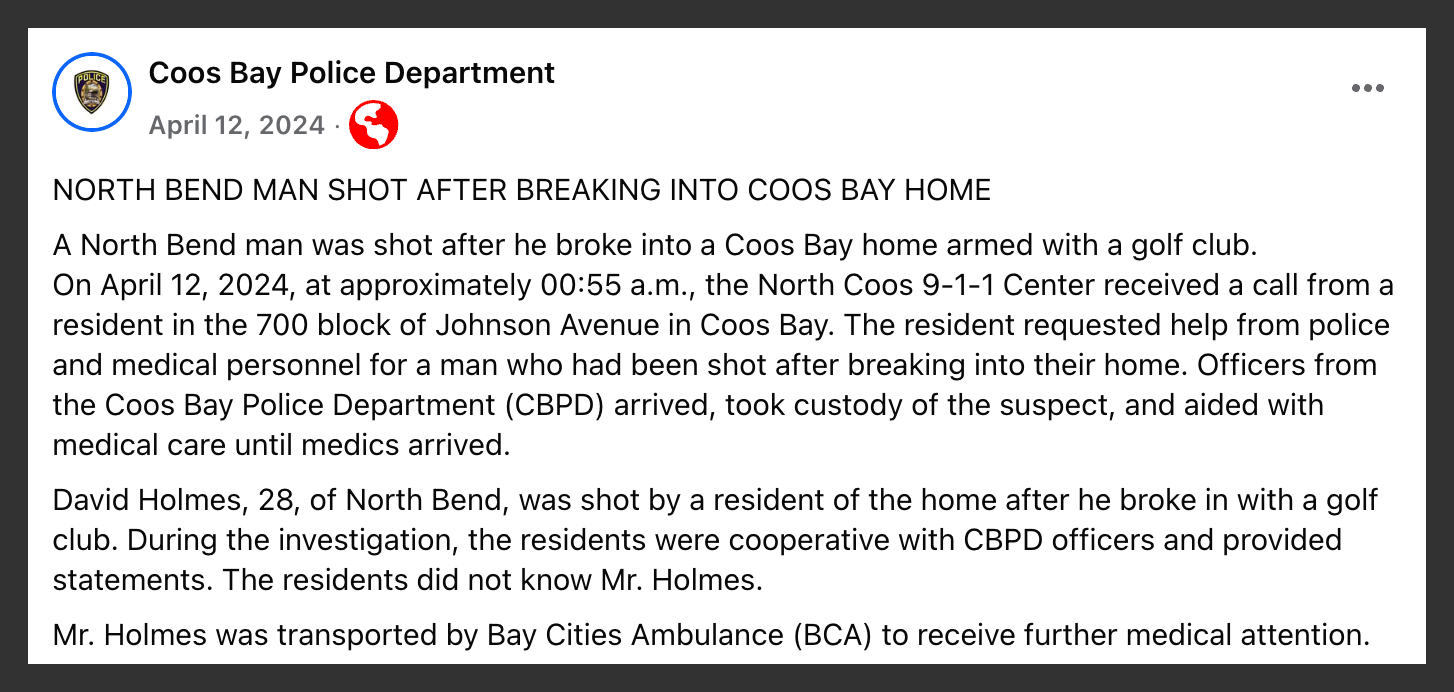 Early on a Friday morning, just before 1 AM, 28-year-old David Holmes made the mistake of trying to break into a Coos Bay home. He was armed with a golf club.