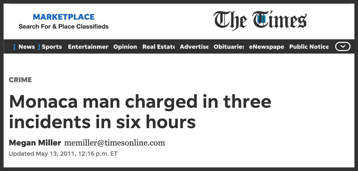 At 6:30 in the morning, he went to the home of an ex-girlfriend’s2 relative and smashed a pane of glass in the front door. He was charged with disorderly conduct and criminal mischief.