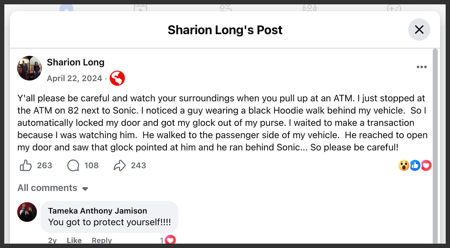 She saw three red flags. She drew her Glock. He ran behind the Sonic. | Original incident: April 22, 2024