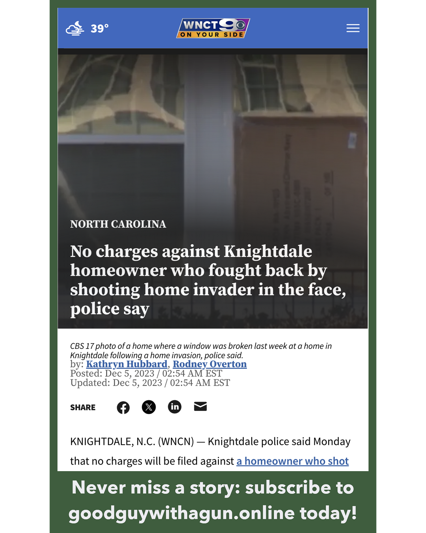 The homeowner wasn’t charged. News reports of home invasion shootings rarely receive follow-up, so it’s nice to see multiple stories reporting that the police and Wake County DA would not press charges against the homeowner.