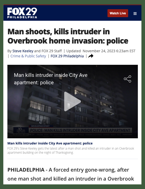 Original incident: Thanksgiving, November 23, 2023. A very short story: An intruder entered an upscale apartment in Philly. The resident was armed.