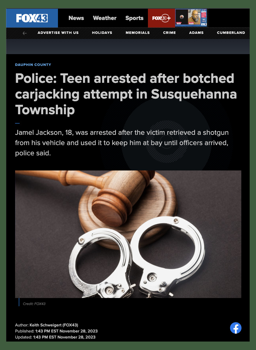 Susquehanna Township is a suburb of Harrisburg, Pennsylvania. A man was working at home there when, just around quitting time, Jamel Jackson approached him. (It’s not clear how. Was the man outside? Did Jackson rang the doorbell? Something else?)