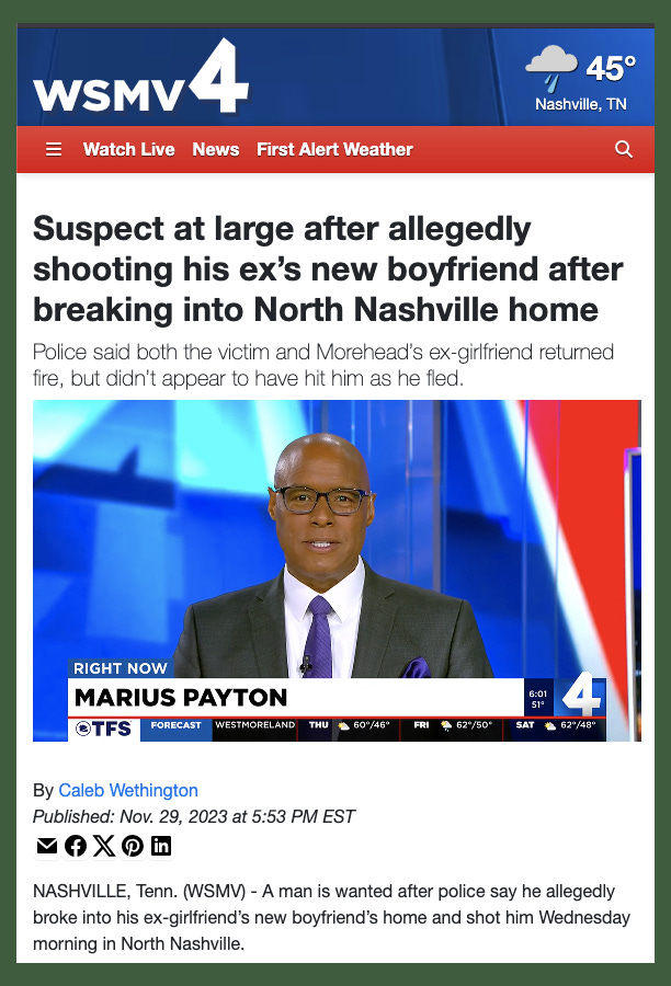 One caveat: Looking at these stories from a distance of a few years sometimes gives closure, but sometimes it raises questions. Searching the Nashville / Davidson County database for “Damarquis Morehead” (including the detailed criminal history) turns up a lot of charges for him, but none of them have an offense date of 11/30/2023. Maybe there’s something I don’t understand — if you do, please let me know in the comments. At any rate, in 2024, Morehead got sentenced to 30 months for being a felon in possession of a handgun.