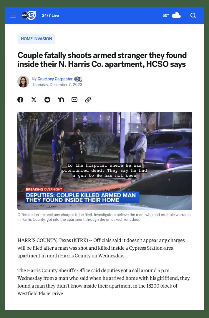 Take a look at how spotty the preliminary information is that we get around DGUs: This is a tweet from the Harris County Sheriff, which gives just the barest of facts. I don’t blame the police, of course, but we should remain aware (and tell other people) about the dearth of facts surrounding most GGWAG incidents.