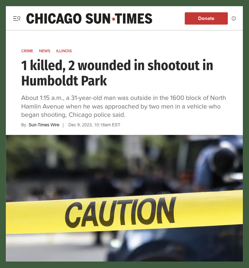 Friday night had slipped into Saturday morning in the Humboldt Park neighborhood of Chicago. A man was walking down the street when two other men came by in a car and started shooting at him.