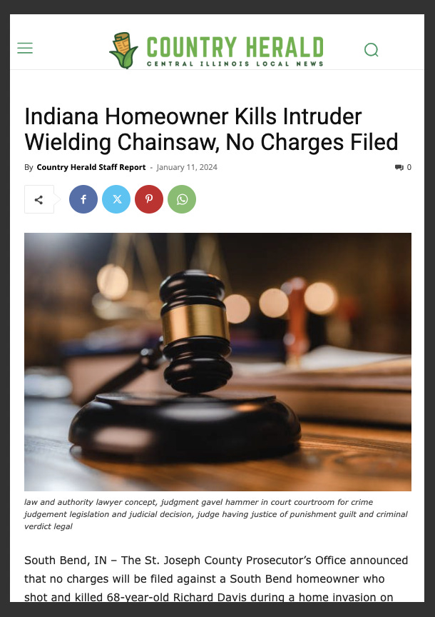 The Country Herald is an example of a press outlet that got it right: Their headline is Indiana Homeowner Kills Intruder Wielding Chainsaw, No Charges Filed.