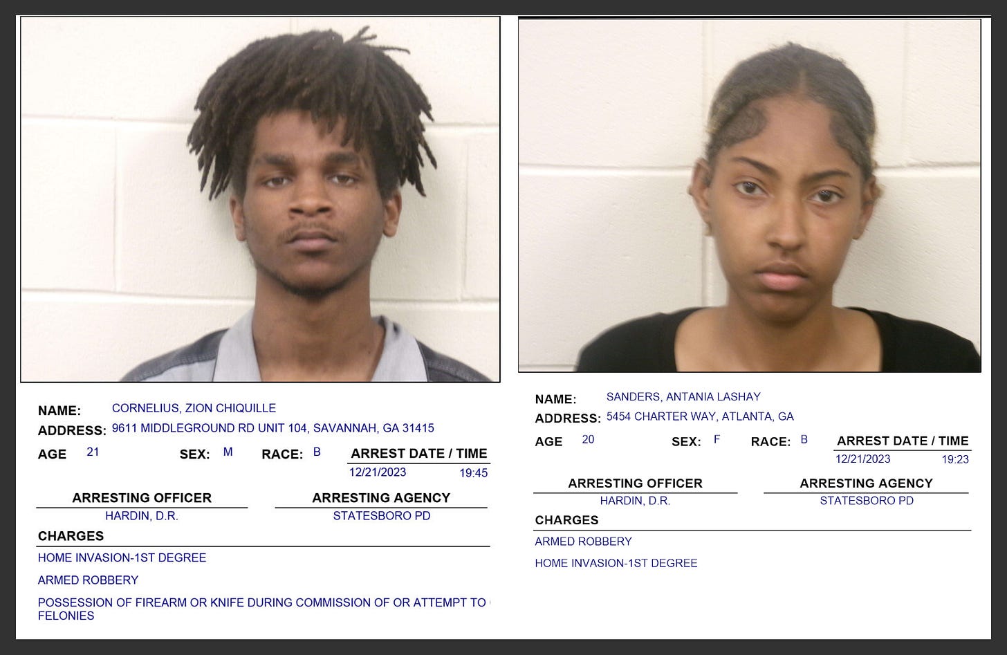 Fortunately, Cornelius later sought treatment for his gunshot wound at a hospital in Claxton, Georgia, about a half-hour south of Statesboro. Police arrested him and his girlfriend there, charging them with Home Invasion - 1st Degree and Aggravated Assault.