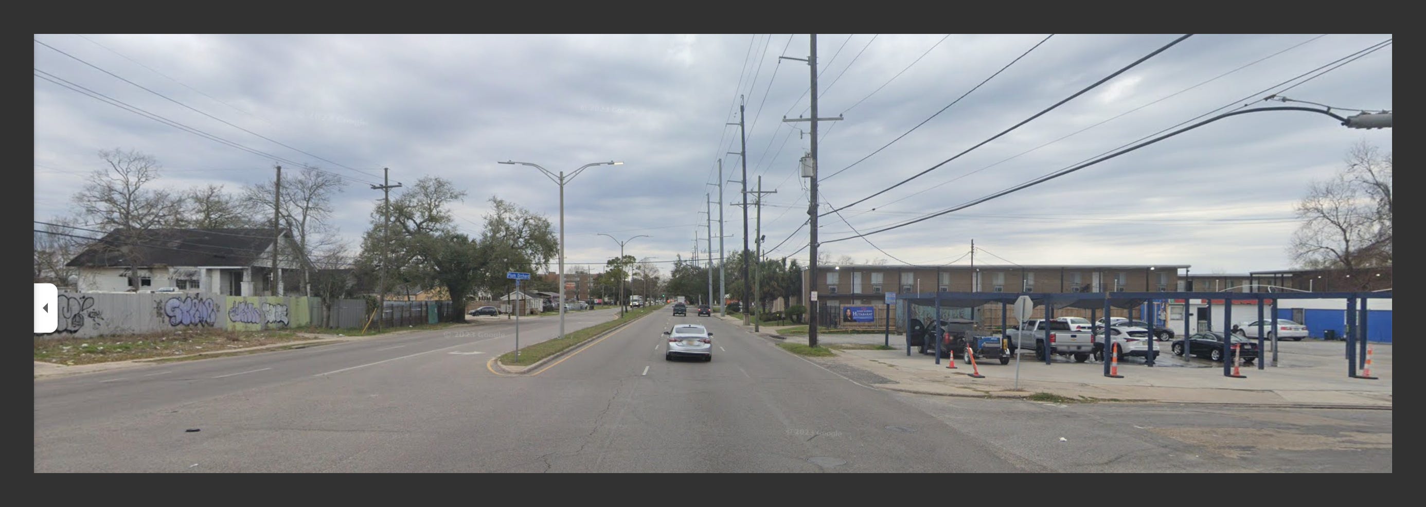 The 7300 block of Chef Menteur Highway in New Orleans East is the boundary of a residential and an industrial area. On the left side of this picture are several chaotic automotive centers, while on the right you can see through a car wash to the Bern Mas apartments. There are houses further to the right of the car wash as well, not visible in this picture.